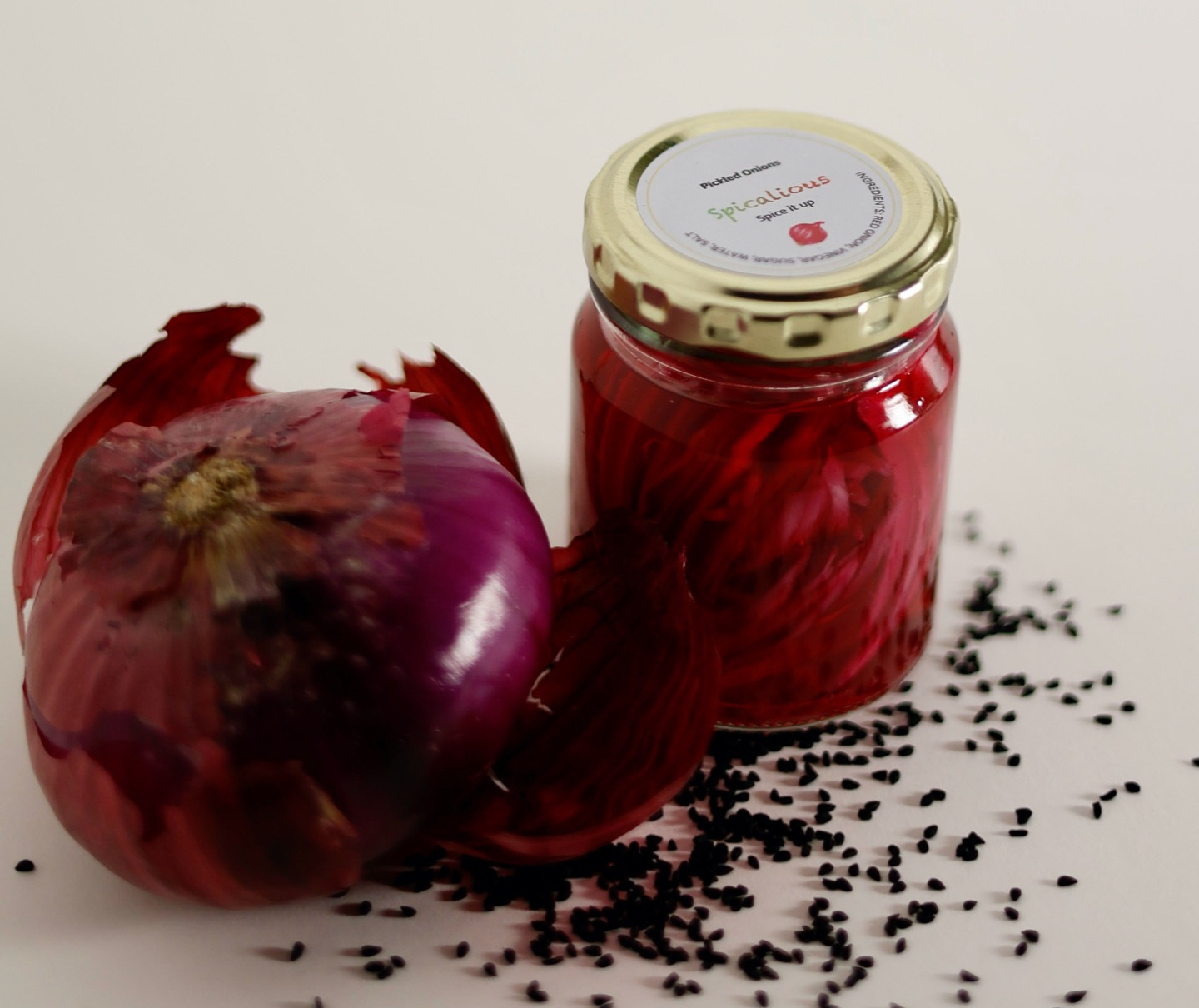 Freshly made to order, pickled red onion adds a lot of flavour to any dish like a salad or charcuterie board, and it does not have a chili flavor.